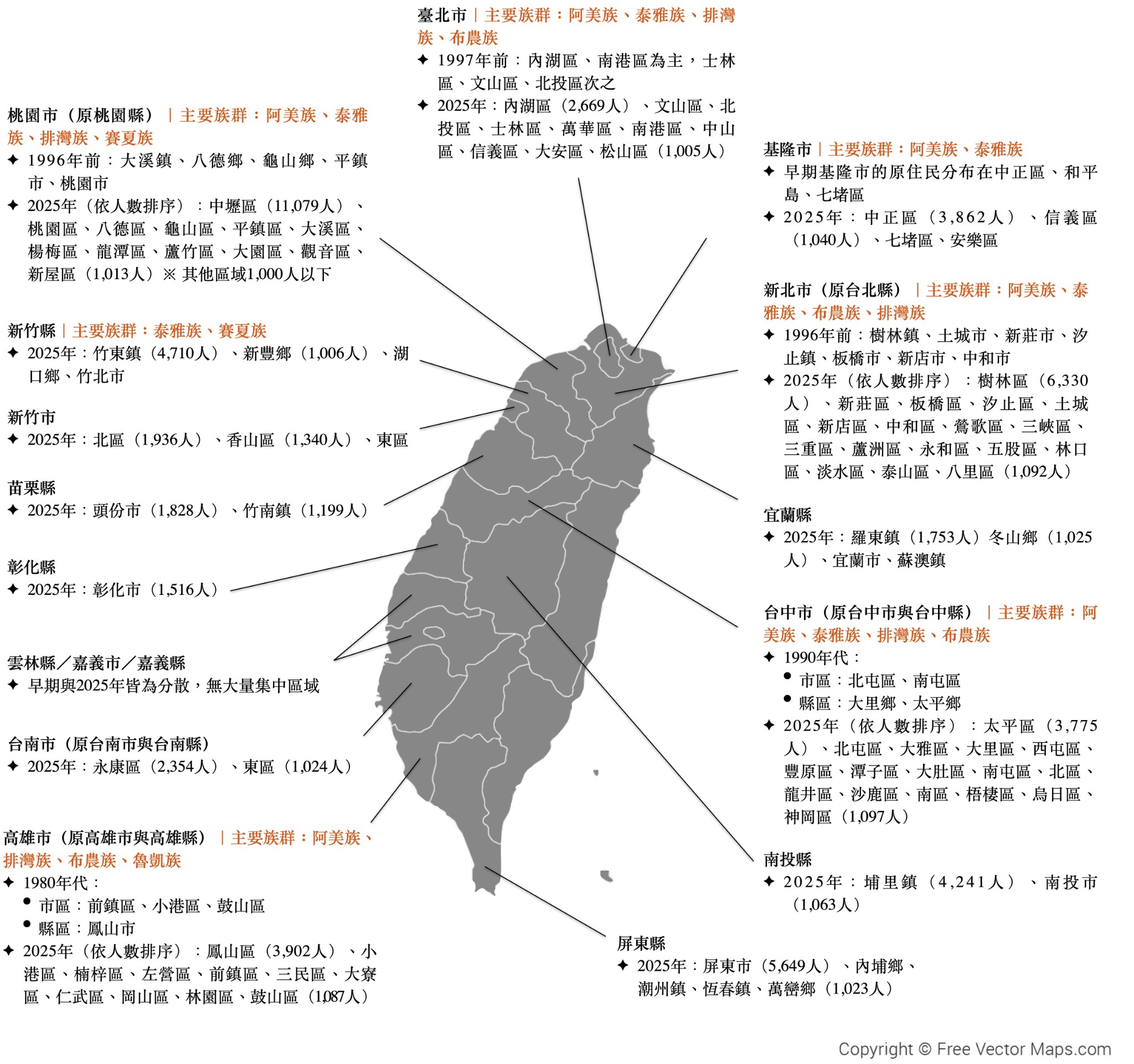 由於原住民族委員會定義非原住民地區為都市原住民居住的區域,所以除花蓮縣和台東縣外,從宜蘭、基隆、台北一直到屏東都是都市原住民的分布位置。然而,依照2025年(民國114年)的人口資料來看,都市原住民的主要分布位置依次為桃園市、新北市、台中市、高雄市、台北市、屏東縣、台南市、新竹縣、基隆市、宜蘭縣、南投縣、彰化縣、苗栗縣、新竹市,這些縣市都市原住民人口均在5,000人以上,其餘縣市則不多。其中以桃園市最多,達77,782人。各縣市都市原住民分布及人口數如圖1所示。