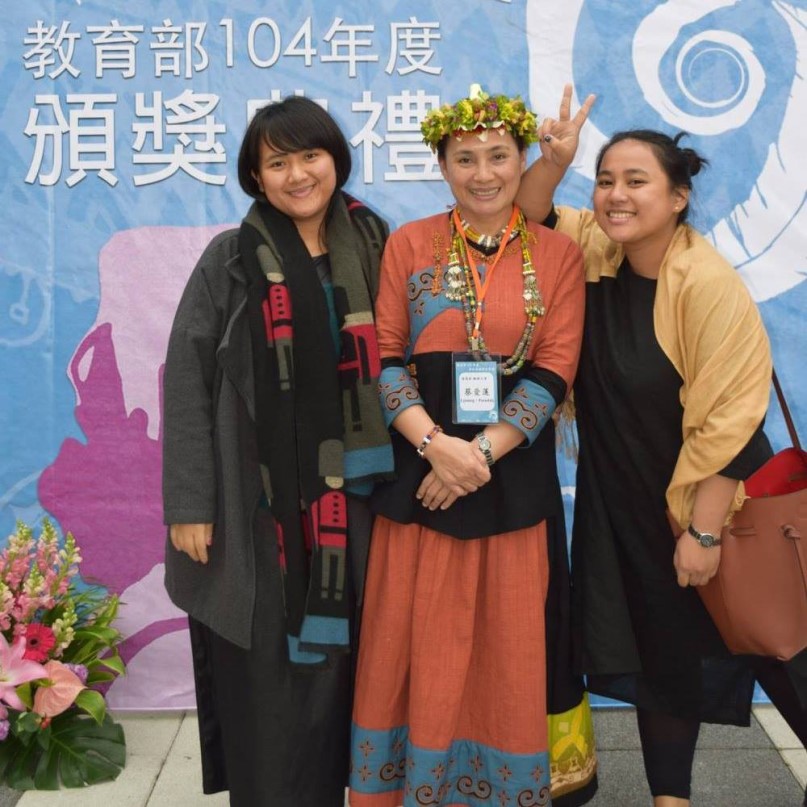 【圖1】2015年(民國104年)教育部第五屆族語文學獎頒獎典禮,與兩位女兒合影。