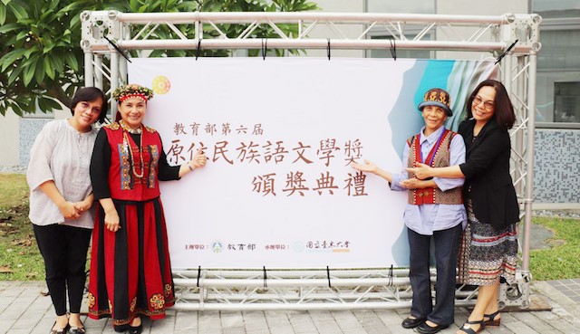 【圖2】2018年(民國107年)教育部第六屆族語文學獎頒獎典禮,與母親、大妹及小妹合影。