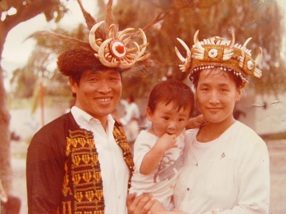 【圖一】24 歲(1984 ,民國 73 年)與夫徐亮超參加排灣族祭儀,懷中孩子徐鴻仁六個月大。