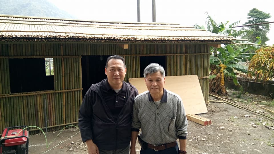 【圖一】48歲(2017,民國106年)5月學校興建太魯閣傳統竹屋建築,邀請退休黃增田校長(右一)蒞校指導。