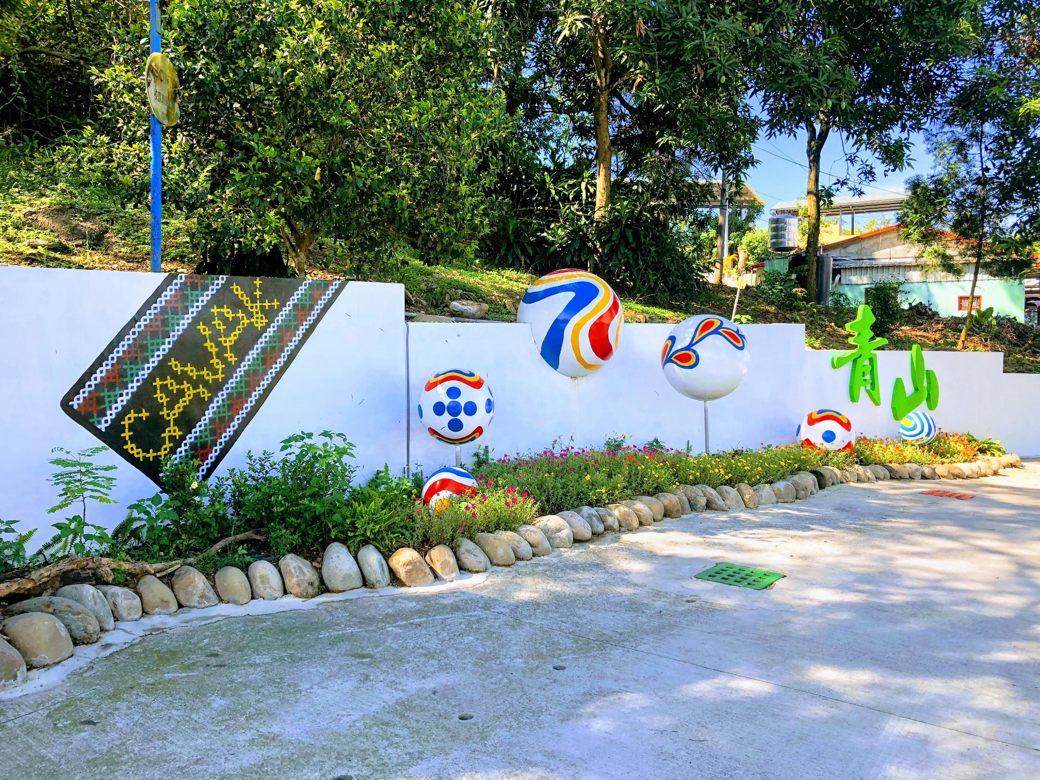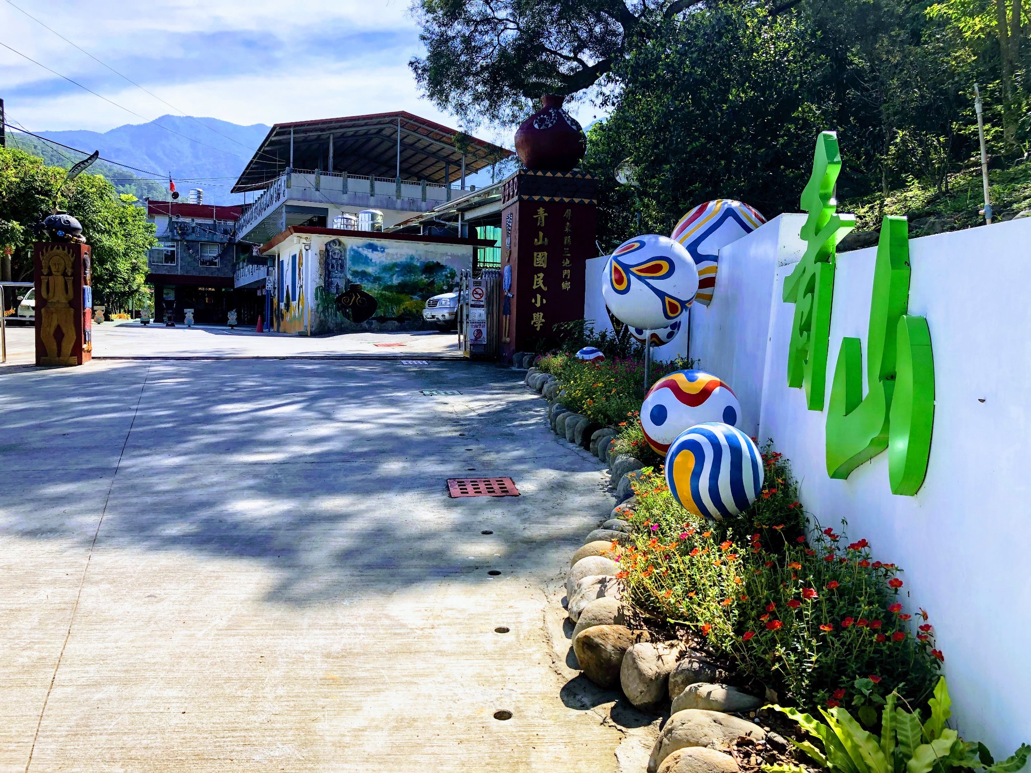 【圖4】106年青山國小獲新校園運動績優校園第三級獎-CAVAK琉璃珠藝想校門-以排灣族琉璃珠項鍊中最為尊貴的mulimulitan為設計概念,轉化出不同的樣貌;色彩鮮明的琉璃珠球、白牆、綠字成為部落的新地標。