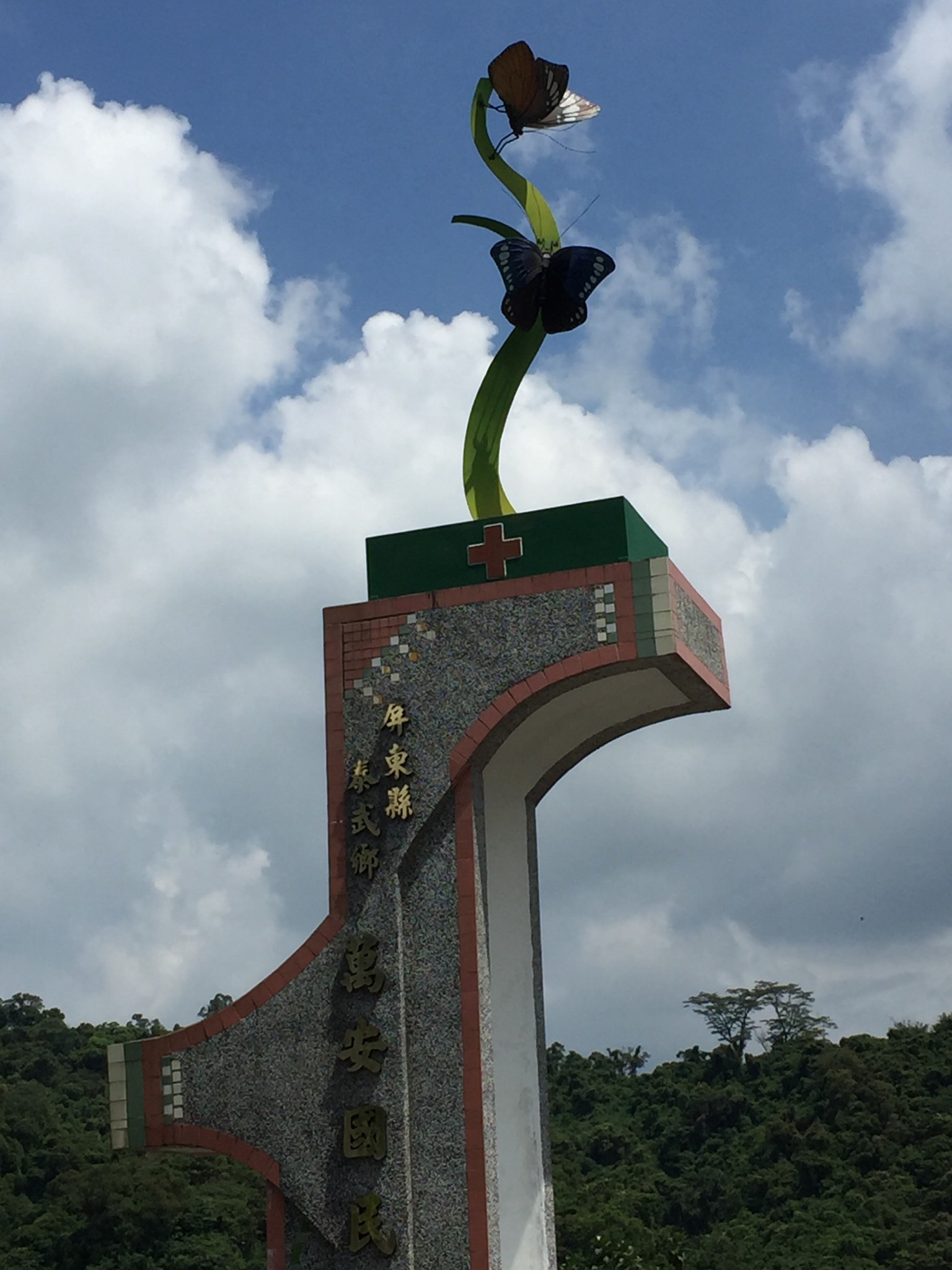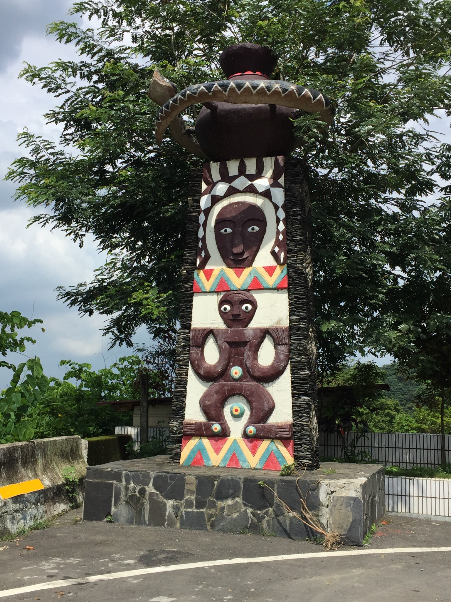 【圖3】萬安村入口意象塔位於萬安村入口處萬安國小正門前,塔高約6米,寬約1米,塔基是由混泥土及大片板岩鑲嵌而成,塔身由黑灰板岩及頁岩碎片堆砌而成,塔頂是由一百步蛇纏繞陶壺組合而成,而底下塔身正面畫有一男一女,代表排灣族的創世神話-蛇生說。