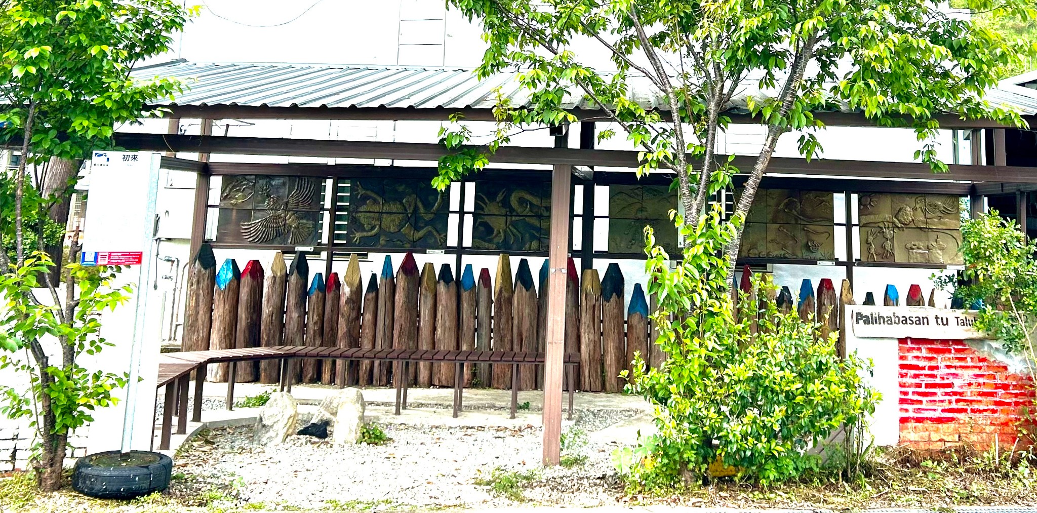 【圖8】初來國小新校門。新校門設計結合玉山(布農族聖山)山形、小米、菱形紋編織、部落動物意象。(許瑞芬拍攝,2024年)
