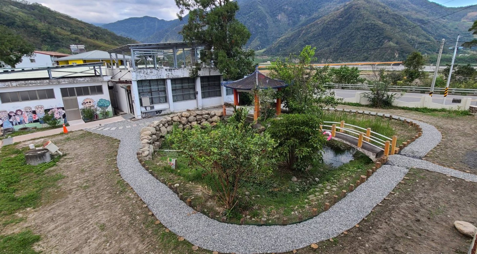 【圖9】初來國小通學步道、琴心亭。從傳說亭延伸進入校園的通學步道,提供學童安全通行。(許瑞芬拍攝,2024年)