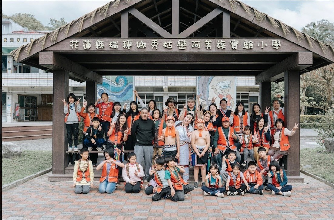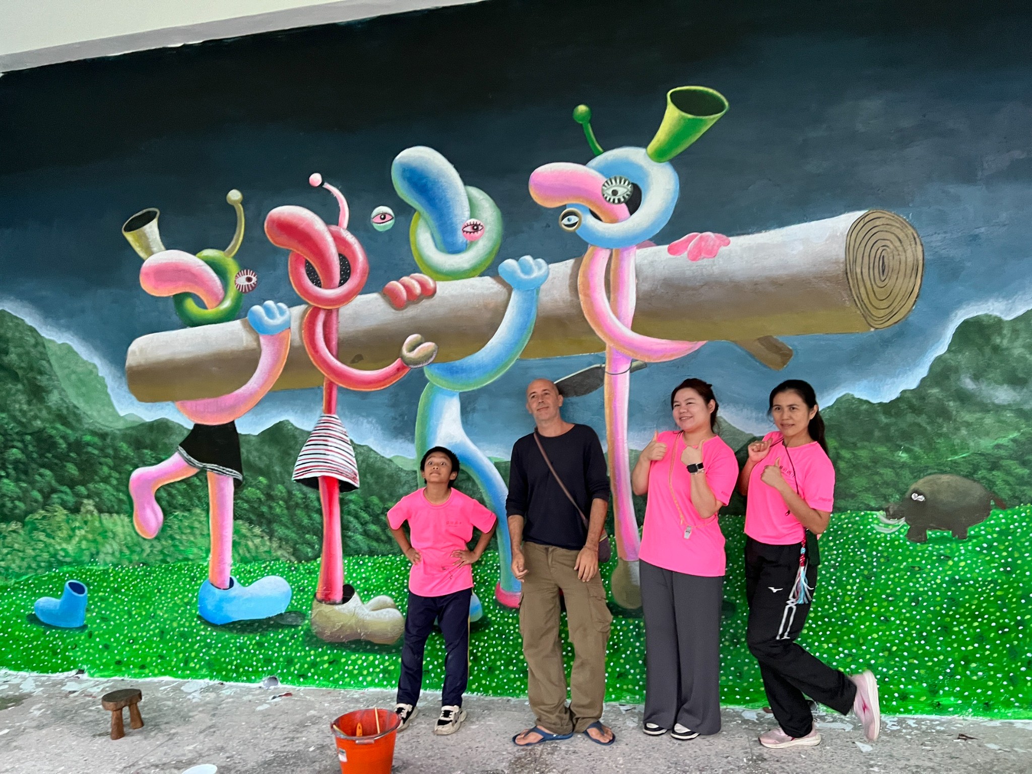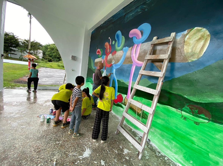 【圖5】西班牙當代藝術家阿里巴魯‧圖魯荷達與學生共同彩繪司令台牆面。(鶴岡國小提供)