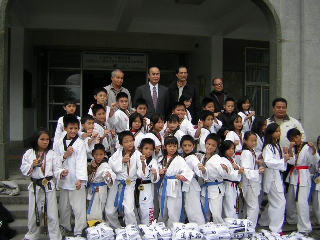 【圖4】景美國小跆拳道隊,左一為校長林信宏,左二為花蓮縣縣長謝深山。(景美國小提供)